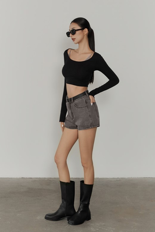 斜肩針織短版長袖上衣